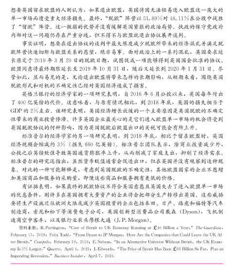 Sources: R. Partington, “Cost of Brexit to UK Economy Running at £40bn a Year,” The Guardian, February 15, 2019; Felix T. et al., “From Dyson to J.P. Morgan, Here Are the Companies Moving Jobs or Operations Out of the UK Because of Brexit,” Quartz, April 19, 2019; J. Edwards, “The Price of Brexit Has Been $65 Billion So Far, Plan an Impending Recession,” Business Insider, April 19, 2019.
