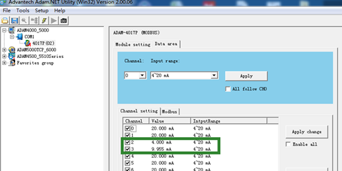 步骤7观测ADAM4017端子口Vin2+(液位)和Vin3+(水温)通道输入的电流值。同时,改变环境中这两项数据时(加水、手握水温传感器金属杆),Vin2+Vin3+通道输入的电流值的变化情况。