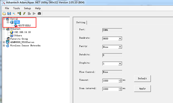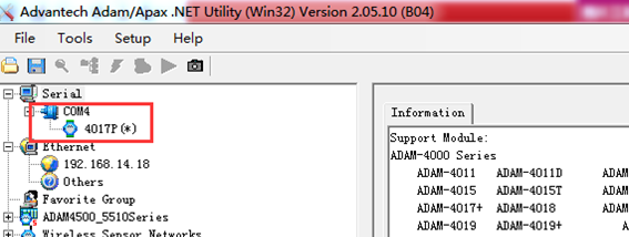 驱动程序安装成功后,双击打开研华Utility软件,可在Utility软件界面左侧树型结构中看到“COM4”,右击选择“Search Device”搜索设备(即开始搜索ADAM4017设备)。模块搜索从0开始,点击“Start”按钮。