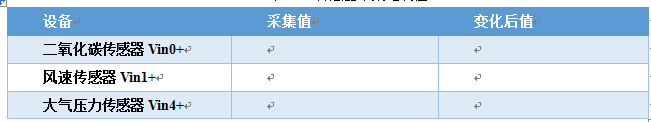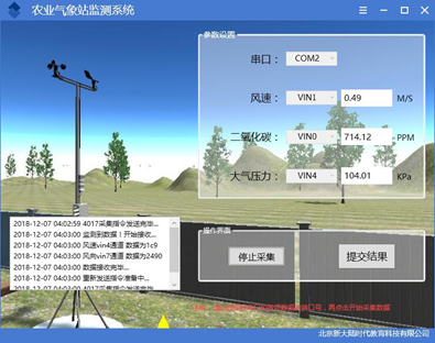 在软件的界面中设置连接的串口号与各硬件设备对应的端口号,二氧化碳传感器:Vn0+、风速传感器Vin1+、大气压力传感器Vin4+。点击“开始采集”按钮,观察界面,查看三个传感器的实时数据。