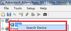 打开研华Utility软件,驱动程序安装成功后,我们可以在Utility软件界面左侧树型结构中看到“COM4”,右击选择“Search Device”搜索设备。模块搜索从0开始,点击“Start”按钮。