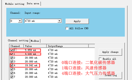 观测ADAM4017输入端Vin0和Vin1和Vin4通道输入的电流值。同时,测试当改变环境中这三项数据时,Vin0和Vin1和Vin4通道输入的电流值的变化情况。