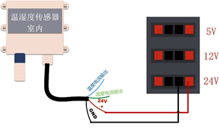 用红黑电源线的红线连接室内传感器外接延长线的红线,红黑线的黑线连接室内传感器外接延长线的黑线,红黑线另外一端接工位两侧的24V电源端子。