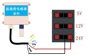 用相同方法,用红黑电源线的红线连接室外传感器外接延长线的棕线,红黑线的黑线连接室外传感器外接延长线的黑线,红黑线另外一端接工位两侧的DC24V端子。