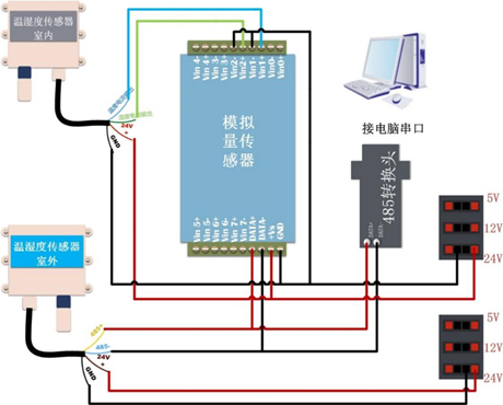 将室内外温湿度传感器、模拟量采集器ADAM4017安装到位置,完成对设备的布线,开始连接