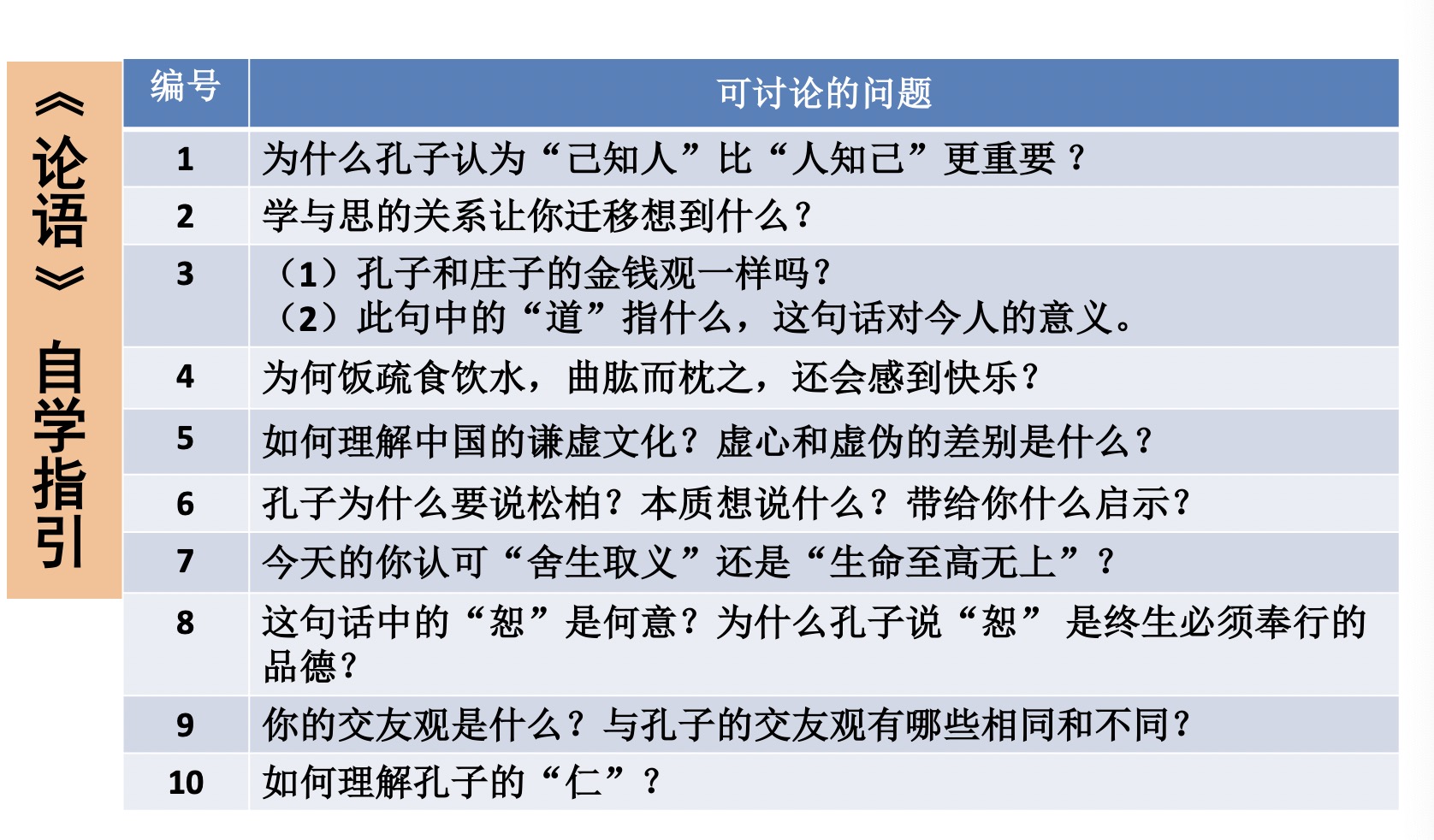 请自学《论语十则》做好翻译,并根据下面的自学指引思考相关问题,在学习通讨论区和课堂上分享你的观点。