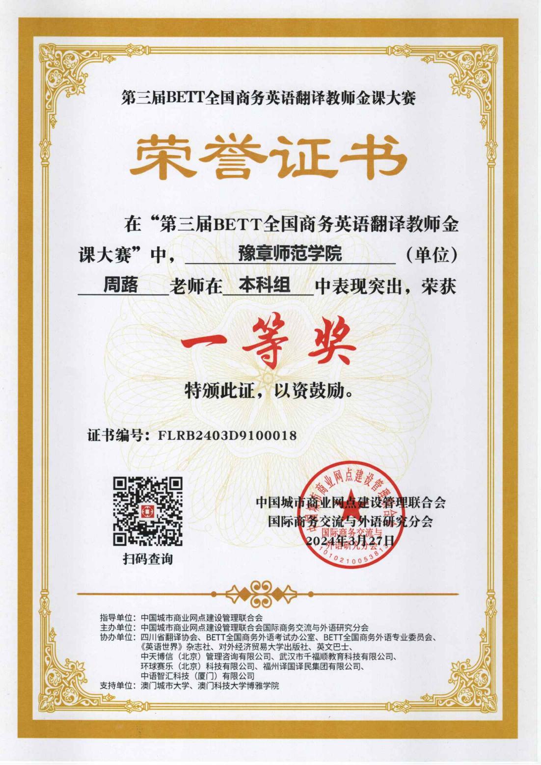 ● 第三届全国商务英语翻译教师金课大赛一等奖