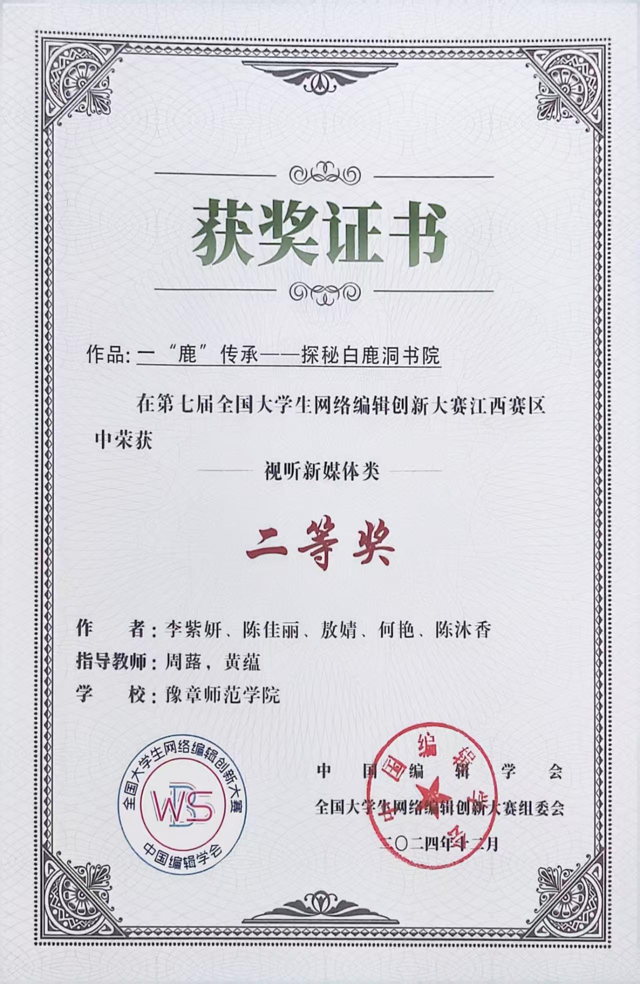 ● 第七届全国大学生网络编辑创新大赛江西赛区视听新媒体类二等奖:一“鹿”传承——探秘白鹿洞书院