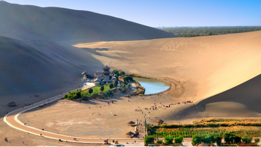 月牙泉位于甘肃省敦煌市西南鸣沙山北麓,四面被鸣沙山环抱,黄沙与碧水共存一处,融