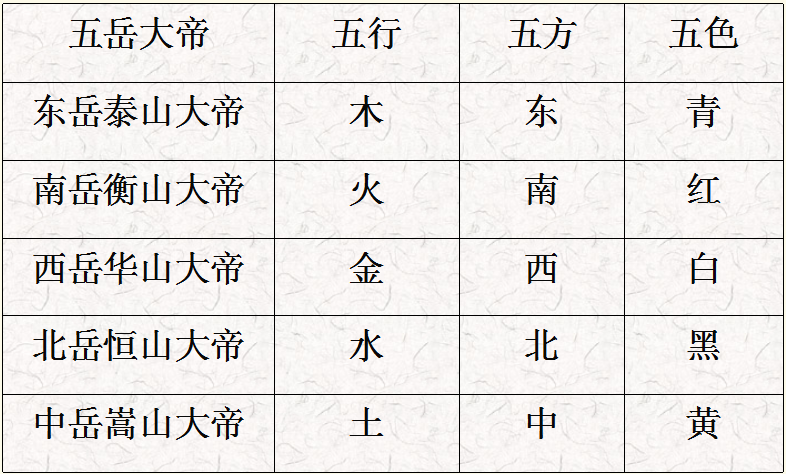 五岳大帝是指东岳泰山大帝、南岳衡山大帝、西岳华山大帝、北岳恒山大帝、中岳嵩山大帝。其信仰源于中国古代的山川崇拜,古人认为山清水秀,云缠雾绕,地大物博,高峻雄伟,神秘莫测,令人敬佩又令人恐惧。于是人们祀之为神,顶礼膜拜。受五行的影响,五岳大帝与五方、五色相配。