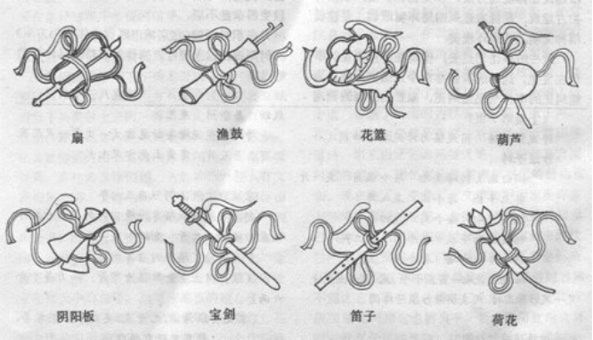 暗八仙:汉钟离扇子、张果老渔鼓、吕洞宾宝剑、铁拐李葫芦、何仙姑荷花、蓝采和花篮、韩湘子笛子、曹国舅阴阳板。