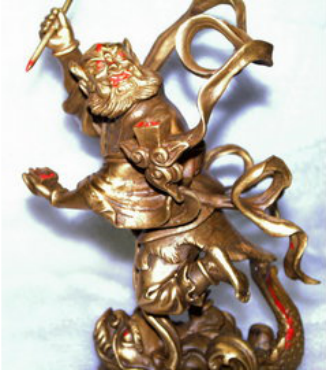 玄武大帝:玄武呈龟蛇状。经书中描绘真武的形象是披发黑衣,金甲玉带,仗剑怒目,足踏龟蛇,顶罩圆光,形象十分威猛。