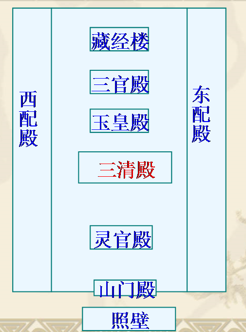 依次为:山门—灵官殿—三清殿—玉皇殿(四御殿)—三官殿—藏经楼