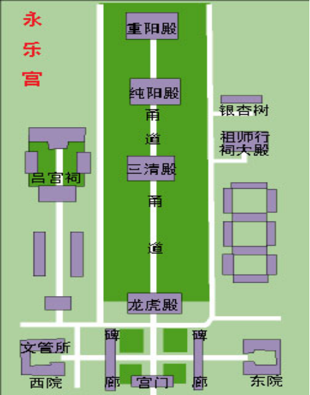 历史:唐“吕祖祠”;金末,道观;元潘德衡主持重建,更名为永乐宫;1959—1964迁移古魏国遗址