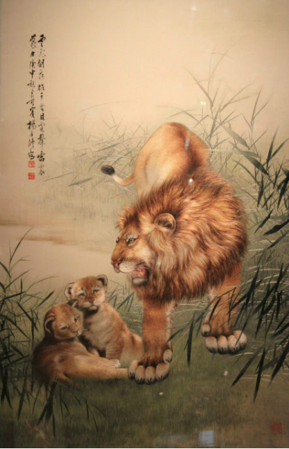 法,达到针脚整齐、线条洒脱、绣工纯熟的境界。至清代,长沙刺绣遍及城乡。湘绣主要以纯丝、硬缎、软缎、透明纱和各种颜色的丝线、绒线绣制而成。其特点是:构图严谨,色彩鲜明,各种针法富于表现力,通过丰富的色线和千变万化的针法,绣出的人物、动物、山水、花鸟等具有特殊的艺术效果。湘绣常以中国画为蓝本,色彩丰富鲜艳,十分强调颜色的阴阳浓淡,形态生动逼真,风格豪放,曾有"绣花能生香,绣鸟能听声,绣虎能奔跑,绣人能传神"的美誉。湘绣以特殊的鬅毛针绣出的狮、虎等动物,毛丝有力、威武雄健。1995年,长沙沙坪镇被国务院授予"中国湘绣之乡"的称号。2006年,湘绣入选第一批国家级非物质文化遗产名录。
