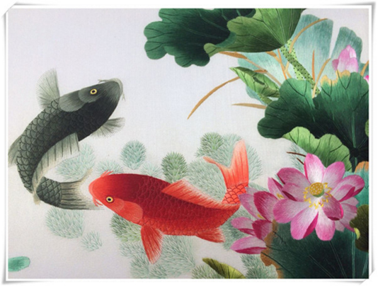 蜀绣又名"川绣",是以四川成都为中心的刺绣品的总称,列入第一批国家级非物质文化遗产名录。蜀绣历史悠久,最早可上溯到三星堆文明,据晋代常璩《华阳国志》记载,当时蜀中刺绣已很闻名,同蜀锦齐名,都被誉为"蜀中瑰宝"。清代道光时期,蜀绣已形成专业生产。蜀绣以软缎和彩丝为主要原料,针法包括12大类122种,针法之多居四大名绣之首,而70余道衣锦线更是蜀绣所独具。题材内容有山水、人物、花鸟、虫鱼等。形象生动,色彩鲜艳,富有立体感,短针细密,针脚平齐,片线光亮,变化丰富,具有浓厚的地方特色。蜀绣常用晕针来表现绣物的质感,体现绣物的光、色、形,把绣物绣得惟妙惟肖。如鲤鱼的灵动、金丝猴的敏捷、人物的秀美、山川的壮丽、花鸟的多姿、熊猫的憨态等。它还采用"线条绣",在洁白的软缎面料上运用晕、纱、滚、藏、切等技法,以针代笔,以线作墨,绣出来的花纹线条流畅、色调柔和。不仅增添了笔墨的湿润感,还具有光洁透明的质感。代表作有龙凤软缎被面和传统产品《熊猫》《芙蓉鲤鱼》最为著名。