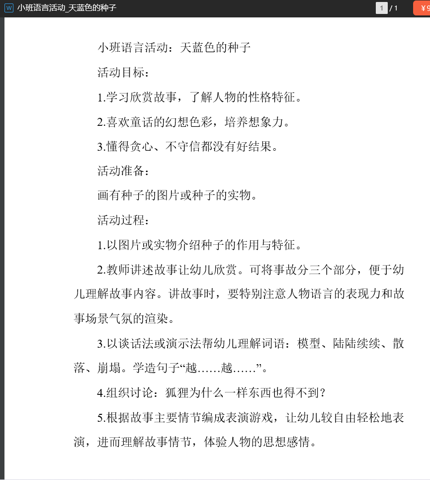 1、根据小班《天蓝色的种子》童话教案尝试课堂教学,对比《小松鼠的尾巴》课堂教学案例,总结童话故事课堂教学的要素。
