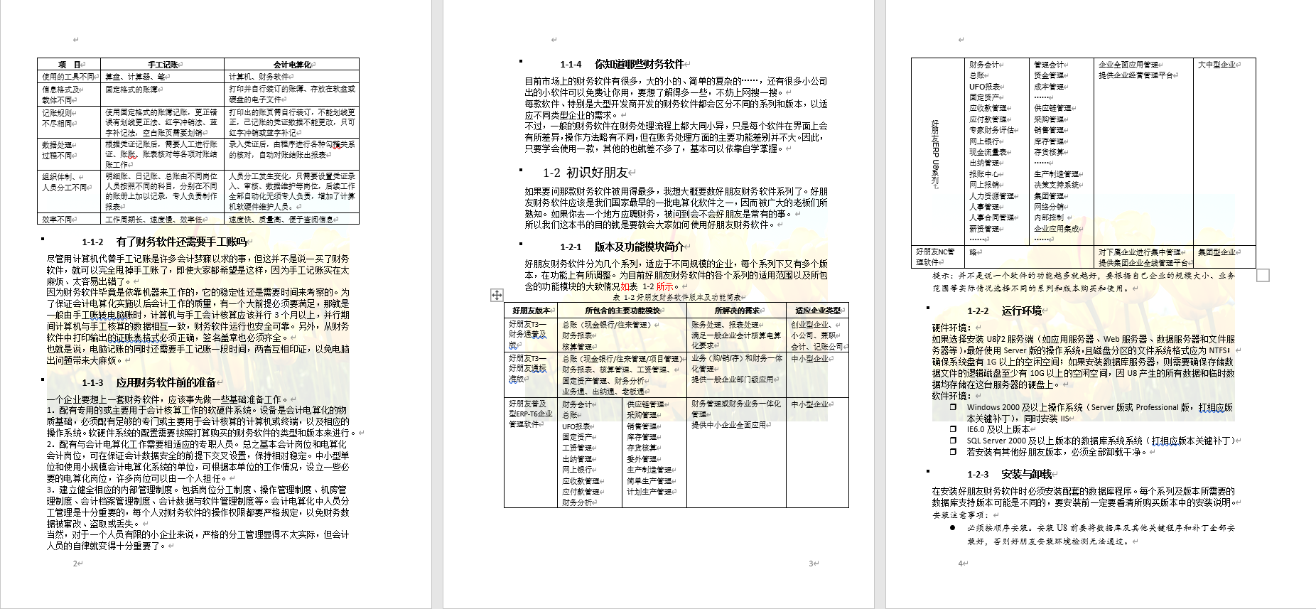 5.在书稿中用红色标出的文字的适当位置,为前两个表格和前三个图片设置自动引用其题注号。为第2张表格“表1-2好朋友财务软件版本及功能简表”套用一个合适的表格样式,保证表格第1行在跨页时能够自动重复、且表格上方的题注与表格总在一页上。