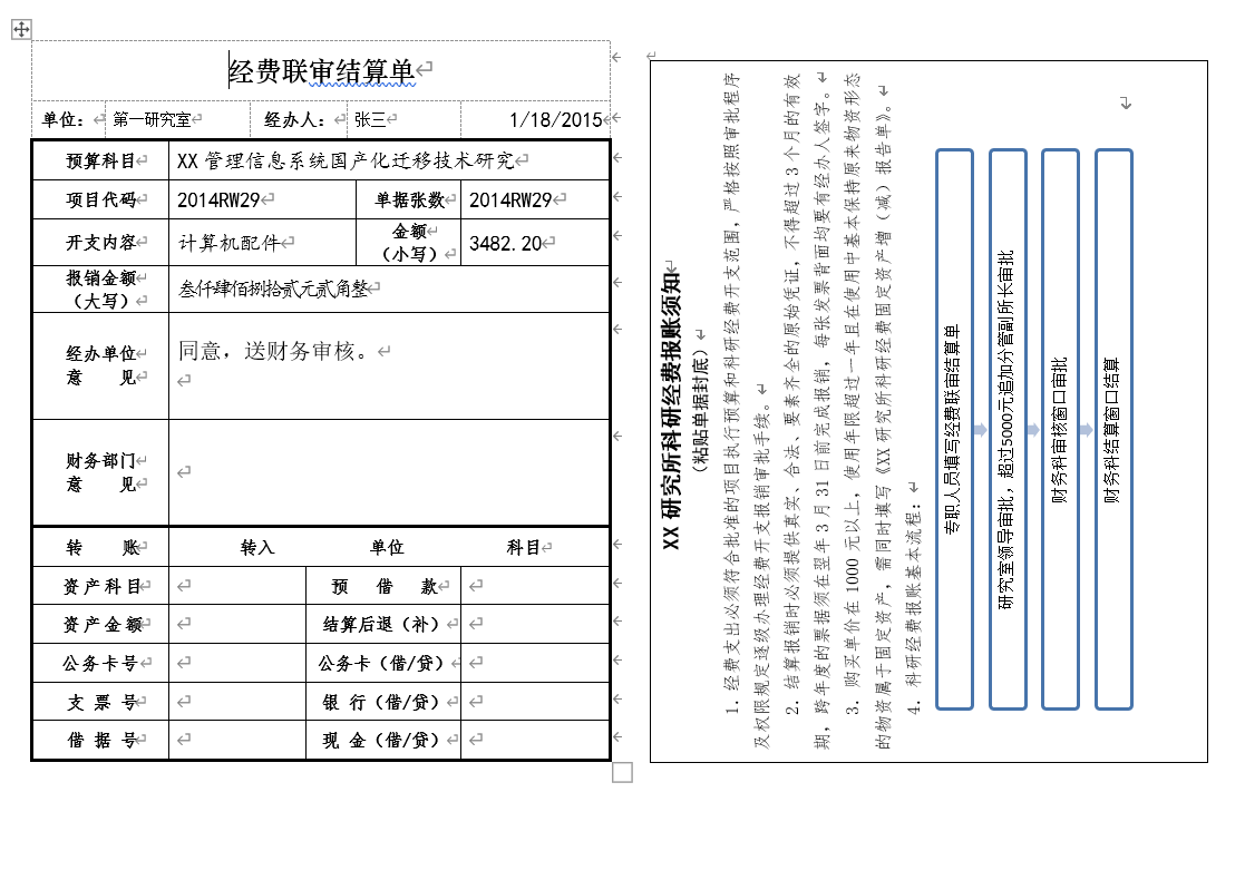 5.《XX研究所科研经费报账须知》以文本框形式实现,其文字的显示方向与《经费联审结算单》相比,逆时针旋转90度。
