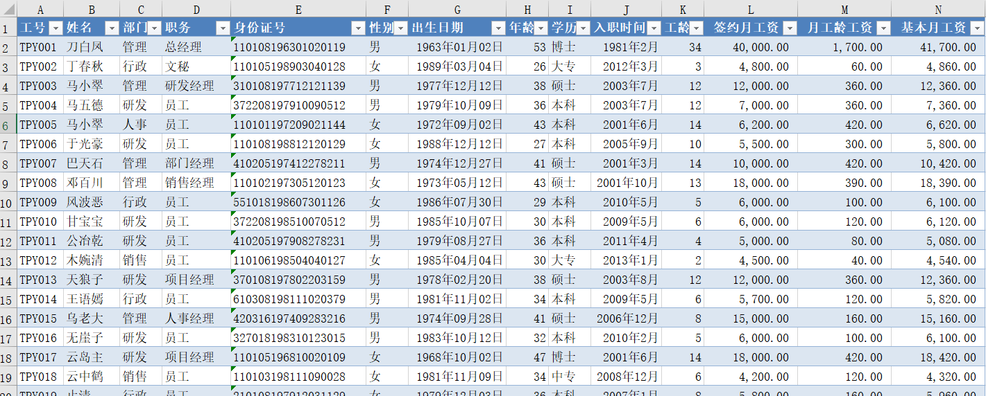 4.在工作表“员工基础档案”中,利用公式及函数依次输入每个学生的性别“男”或“女”,出生日期“xxxx年xx月xx日”,每位员工截止2015年9月30日的年龄、工龄工资、基本月工资。其中: