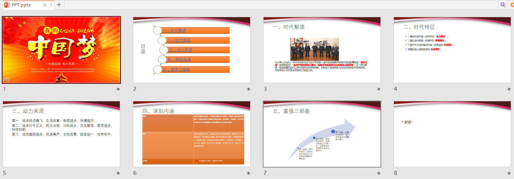 团委张老师正在准备有关“中国梦”’学习实践活动的汇报演示文稿,相关资料存放在Word文档“PPT素材及设计要求.docx”中。按下列要求帮助张老师完成演示文稿的整合制作: