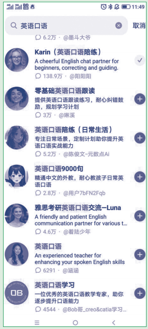 在“对话”界面下方选择“发现”按钮,进入智能体搜索页面。搜索“英语口语”可以找到“ Karin(英语口语陪练)”。豆包 karin 英语口语陪练智能体界面如下图所示。