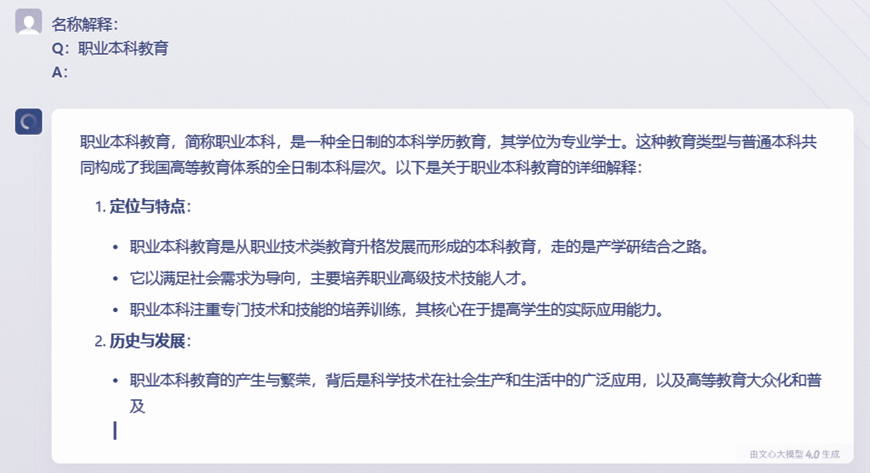 就像我们在“续写型提示词”中使用“?”“()”等符号来提示 AI 大语言模型该在什么地方进行续写一样,我们也可以在指令型提示词中使用“ Q/A 对”,帮助 AI 模型理解提问和回答的位置。其中,Q 代表“问题”(Question),A 代表“回答”(Answer)。例如,如果你想了解职业教育,可以使用如下方式设计 AI 提示词。