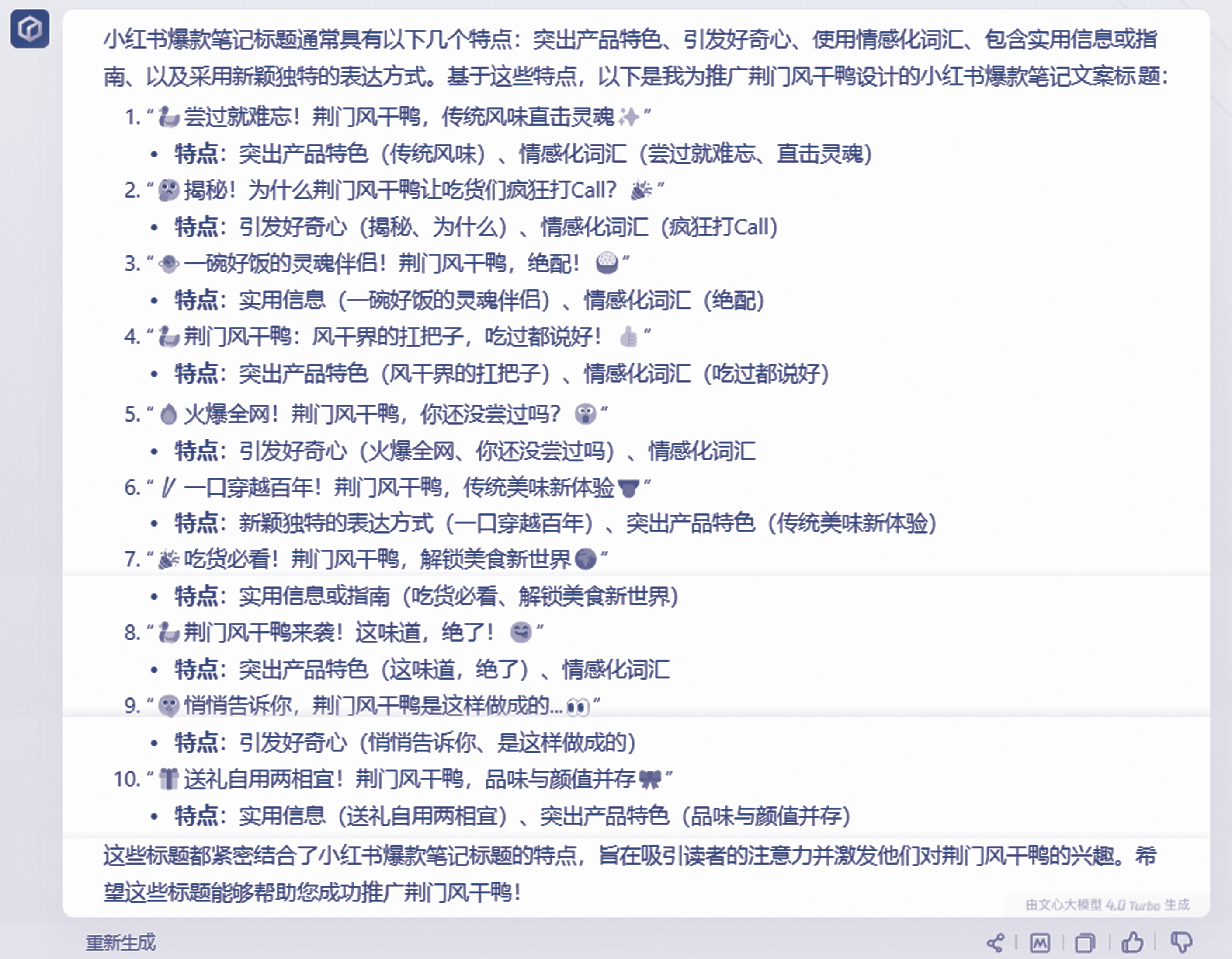 你是一位小红书文案专家,我准备在使用小红书笔记推广荆门风干鸭,请在提炼总结小红书爆款笔记标题的特点的基础上,根据这些特点帮忙设计推广荆门风干鸭的小红书爆款笔记文案的标题,不少于 10 个。