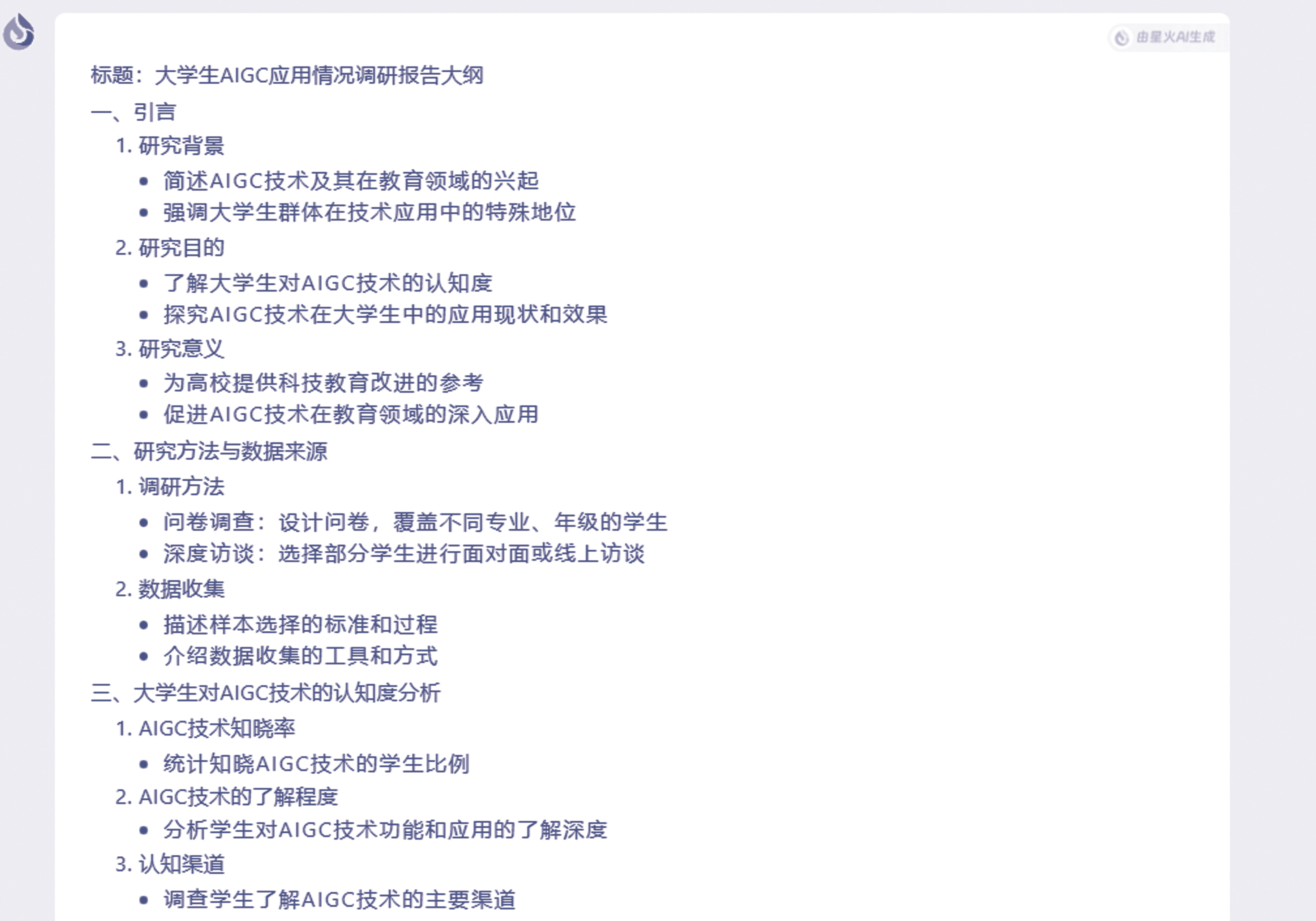 AI 赋能的调研报告大纲通过智能数据分析,为决策者提供深度洞察。它首先定义研究目标和问题,然后利用 AI 工具收集和处理大量数据。接着,AI 技术进行模式识别和趋势预测,生成关键发现。最后,结合人类专家的见解,形成战略性建议和行动方案。整个过程提高了报告的准确性和效率,确保信息的实时性和相关性。以大学生 AIGC 应用情况调研为例。