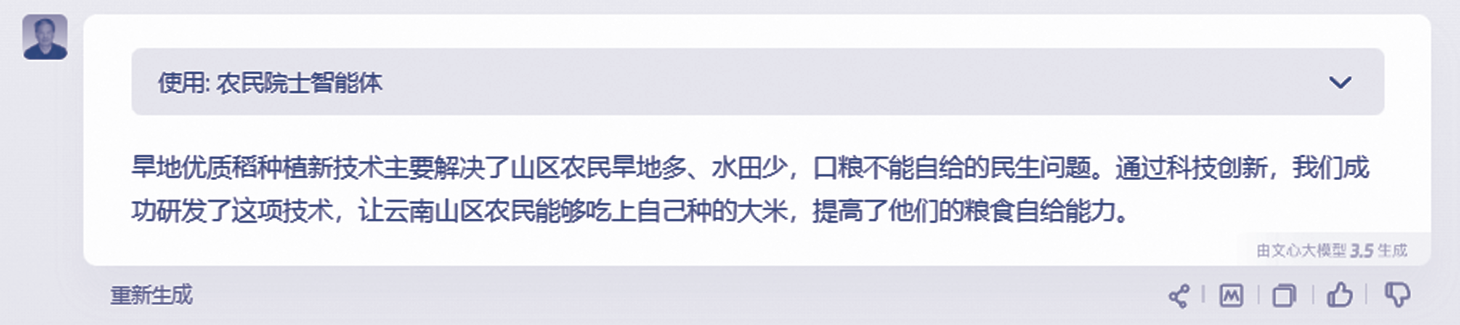 “农民院士智能体”(如图所示)由中国工程院朱有勇院士在文心智能体平台上搭建。朱院士专注于旱地优质稻的研究多年。构建该智能体致力于帮助农民朋友提高旱地水稻的产量和品质,解决种植过程中的各种问题。同时,团队与百度共同打造了“农民院士智能体”,这个智能体可以解答大家在种植旱地优质稻等农作物过程中的常见问题,帮助大家更好地掌握农业技术知识,解决农业生产问题。