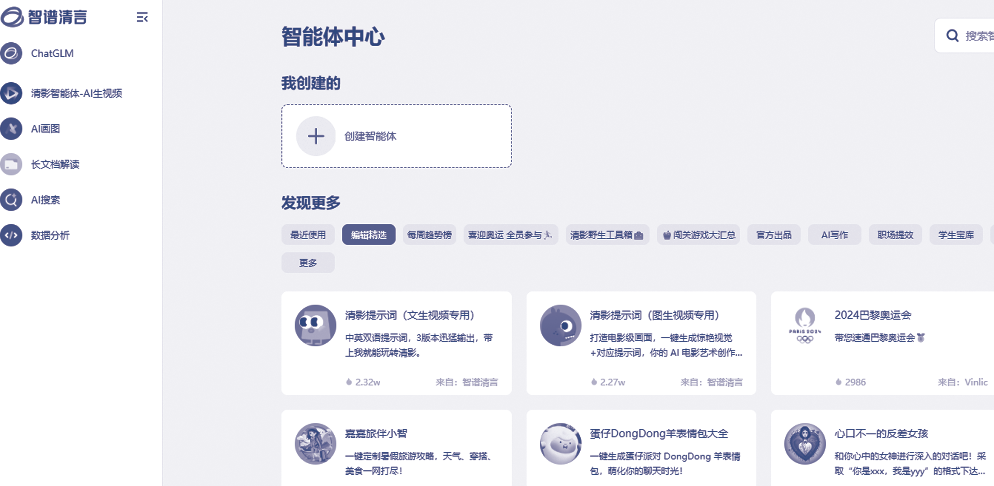智能体中心是智谱清言为用户提供的一个统一管理平台,用户可以在这里查看、管理、监控和应用所有已创建的智能体。