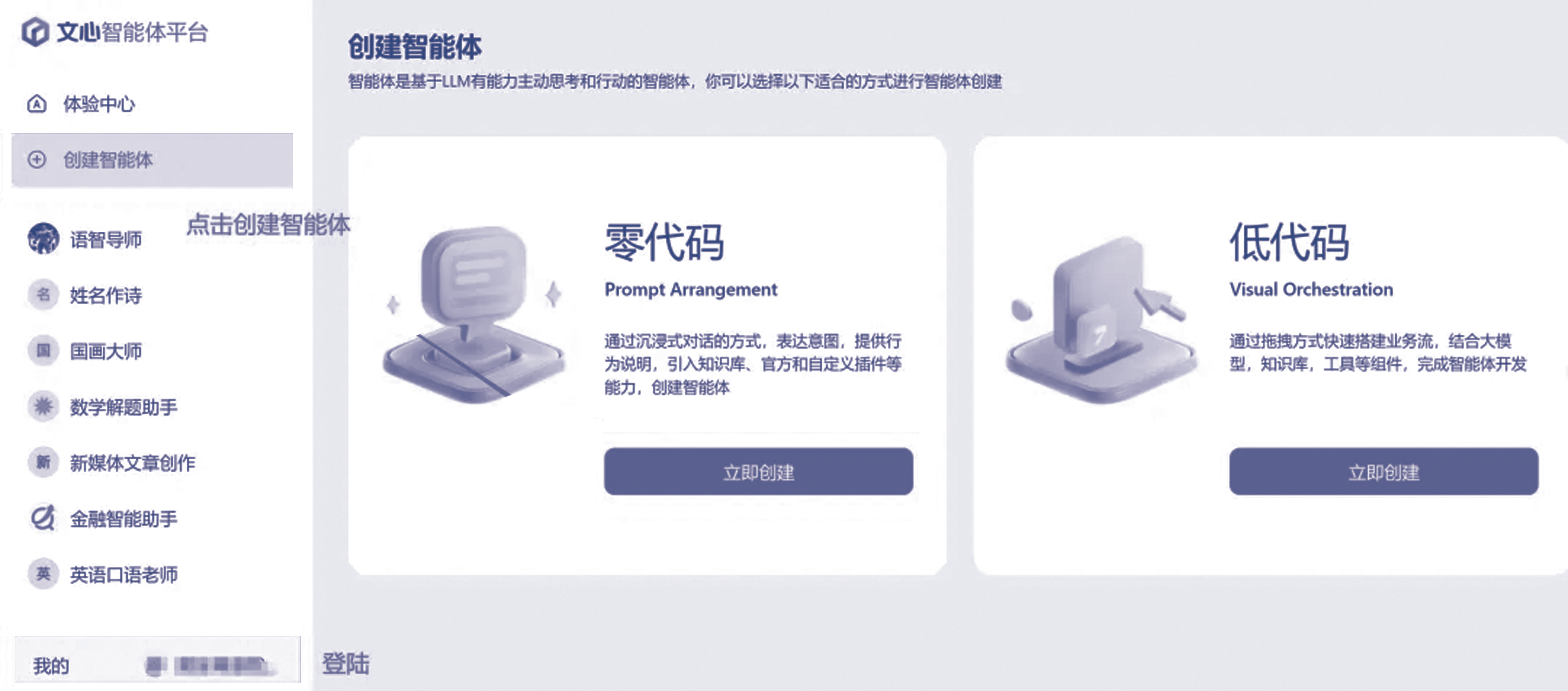 1. 进入智能体创建页面。在 PC 电脑打开文心智能体平台,并点击“创建智能体”,选择“零代码”“立即创建”,如图 所示。