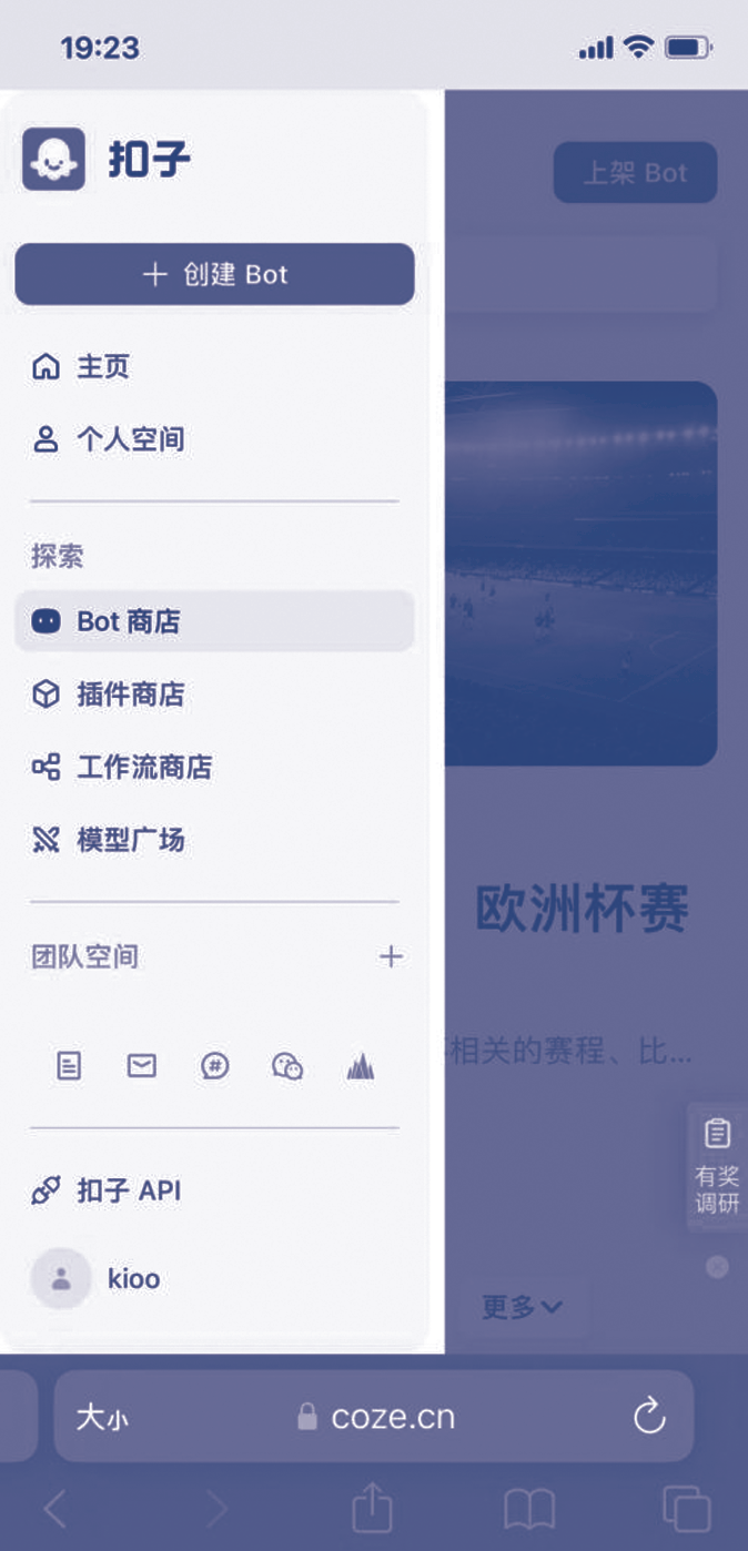 1. 使用手机浏览器打开扣子(www.coze.cn),并登录。注意:在扣子平台,智能体的名称是 Bot。进入创建 Bot 界面,点击左上角“ + 创建 Bot”按钮开始创建智能,如图所示。