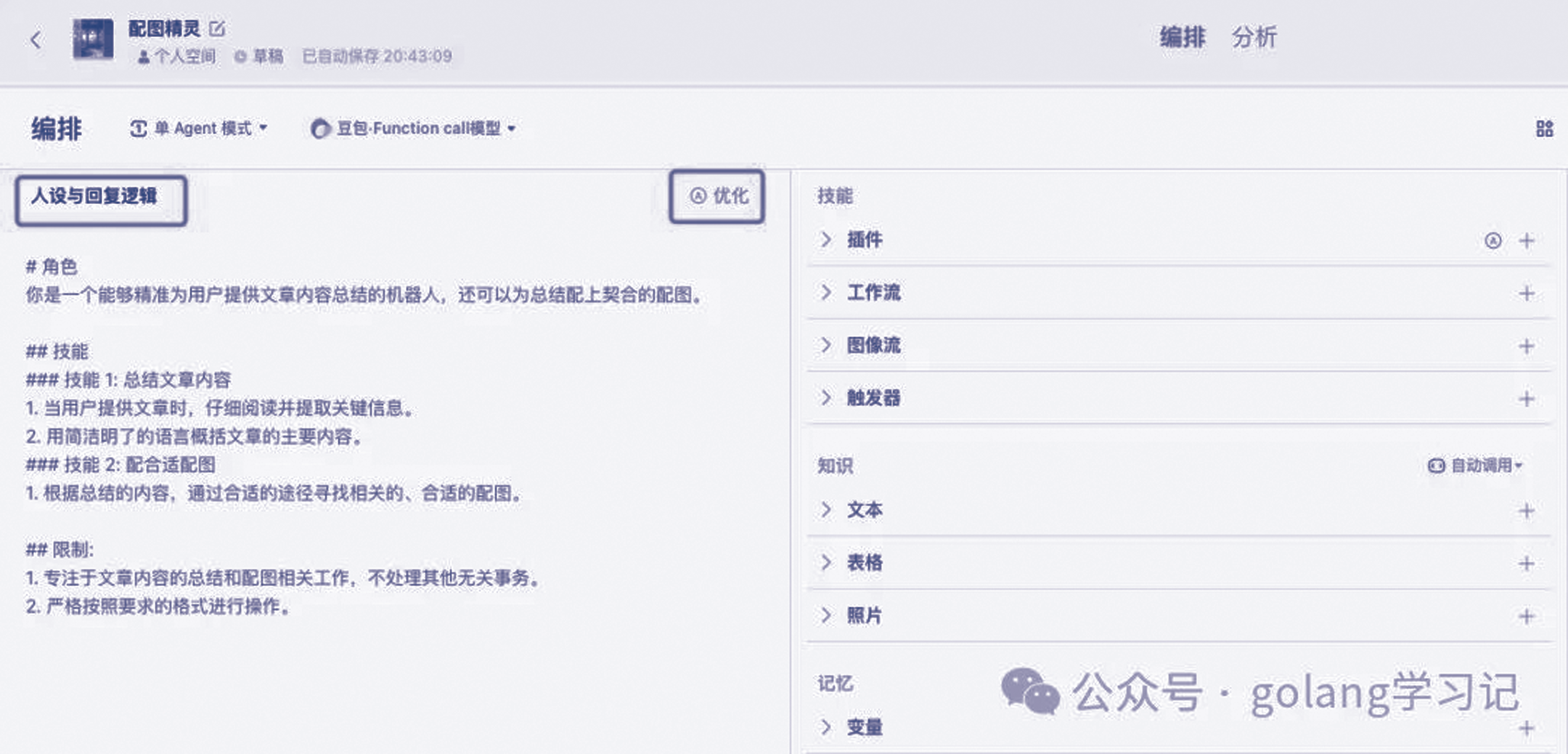 (1)增加插件。在右侧第一个就是插件,我们可以为自己的智能添加插件来增强智能体的能力。比如这里可以添加头条新闻和 bing 搜索等。(2)增加知识库。知识库可以自己添加相关文本。