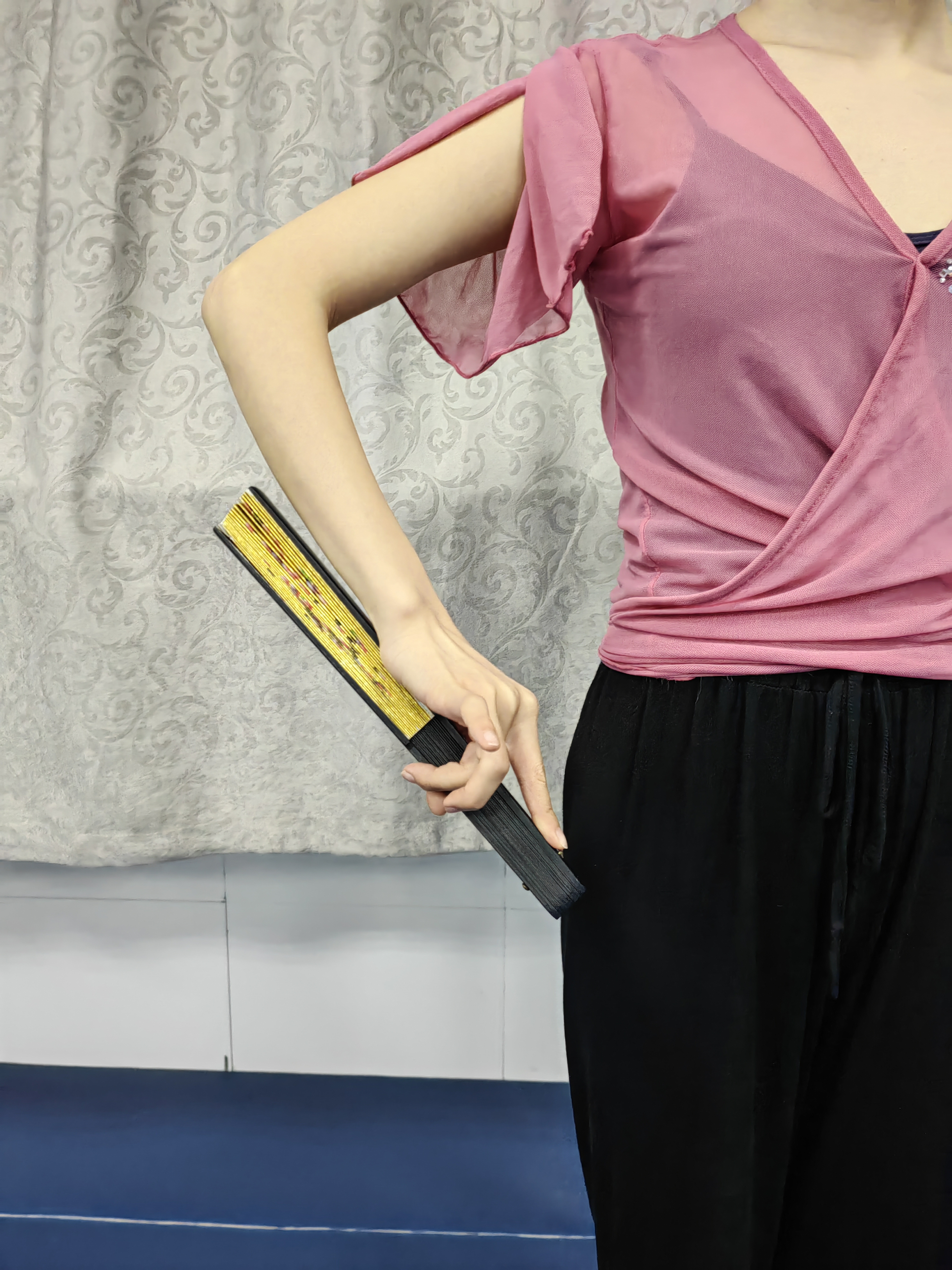 拳式握扇:拇指与食指、中指关节轻捏扇柄,无名指与小指微曲放松,手心与扇柄贴合,下侧扇骨大边通常贴于小臂内侧,扇面可随手腕转变(图1)。