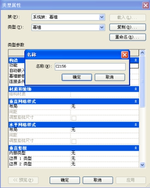 2、单击“建筑”—“墙”—“幕墙”,单击复制,创建新的幕墙类型,输入新的名称 “C2156”
