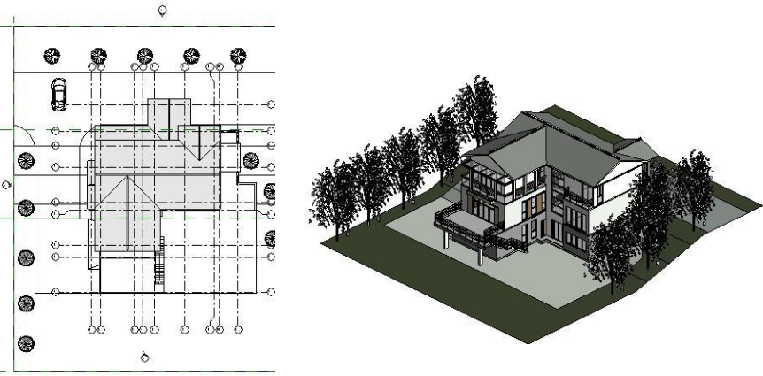 在“场地”平面图中根据自己的需要在道路及别墅周围添加场地构件树。