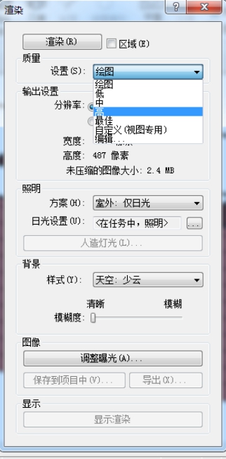 “渲染”按钮,弹出“渲染”对话框,调节渲染出图的质量,在“质量”选项组的“设