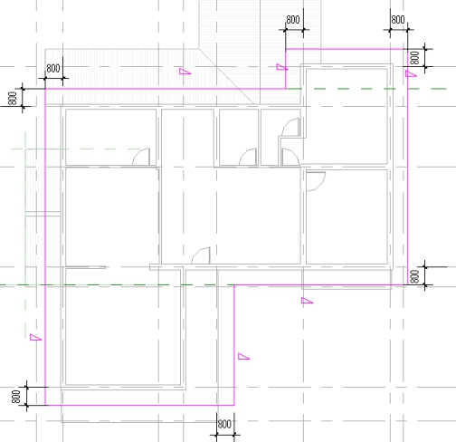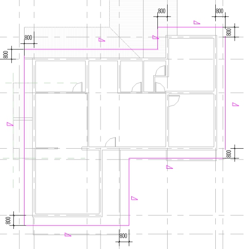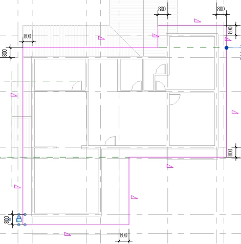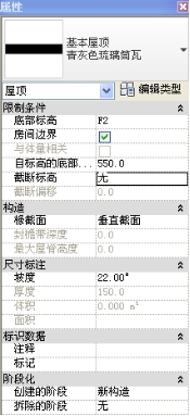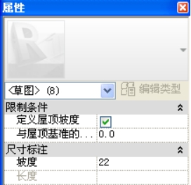 在相应的轴线向外偏移 800mm,绘制出屋顶的轮廓—单击“属性”命令,设置屋顶的“坡度”参数为 22°。