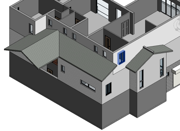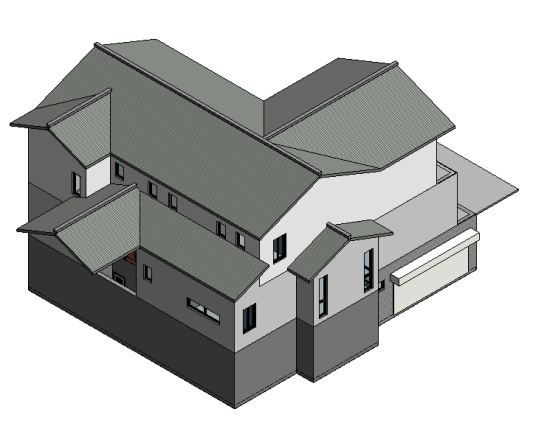 5、 单击“完成”命令创建了二层多坡屋顶。选择屋顶下的墙体,选项栏选择“附着”命令,拾取刚创建的屋顶,将墙体附着到屋顶下。同前所述创建新建屋顶屋脊,如图 8.3-15。保存文件。