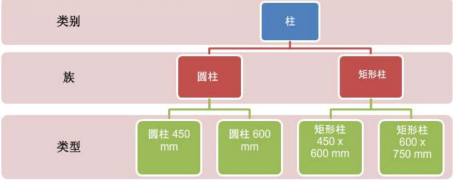 族是某一类别中图元的类,用于根据图元参数的共用、使用方式的相同或图形表示的相似来对图元类别进一步分组。一个族中不同图元的部分或全部属性可能有不同的数值,但是属性的设置(其名称和含义)是相同的。例如,结构柱中的“圆柱”和“矩形柱”都是柱类别中的一族。