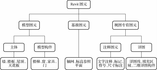 在创建项目时,用户可以通过向设计中添加参数化建筑图元来创建建筑。在Revit 2016中,图元主要分为模型图元、基准图元和视图专有图元三种,如图所示。