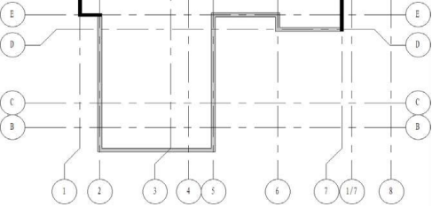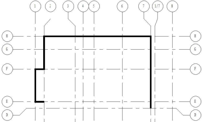 线,移动光标单击鼠标左键捕捉E轴和2轴交点为绘制墙体起点,顺时针单击捕捉 E 轴和 1 轴交点、F 轴和 1 轴交点、F 轴和 2 轴交点、H 轴和 2 轴交点、H 轴和 7  交点、D 轴和 7  轴交点、绘制上半部分墙体,如图 4.1.1所示。