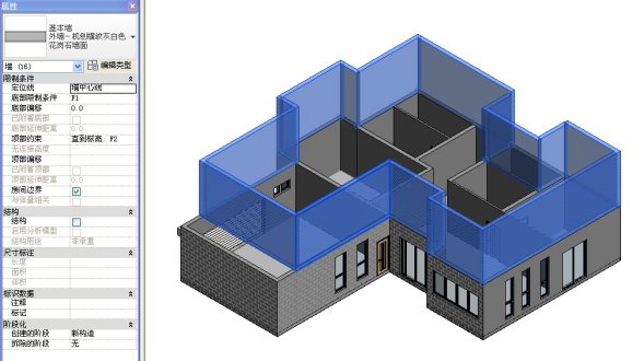 ⑥单击选项栏“属性”按钮,设置二层墙体的“顶部限制条件”为“直到标高 3F”。