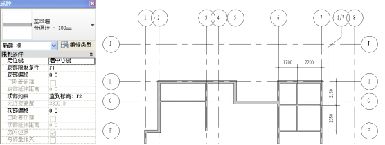 ②在类型选择器中选择“基本墙:普通砖-lOOmm”,选用“绘制”命令,设置属性参数“底部限制条件”为“F2”,“顶部限制条件”为“直到标高 F3”,如图绘制“普通砖-lOOmm”内墙。