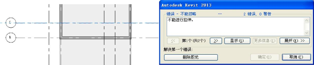 ②调整外墙位置:单击工具栏中的“对齐”命令 ,如图 2.4-28 移动光标单击拾取 C 轴线作为对齐目标位置,在移动光标到 B 轴的墙上,按 Tab 键拾取墙的中心线位置单击拾取,移动墙的位置使其中心线与 B 轴对齐,如图 2.4-29 所示。提示错误,选择“删除图元”。