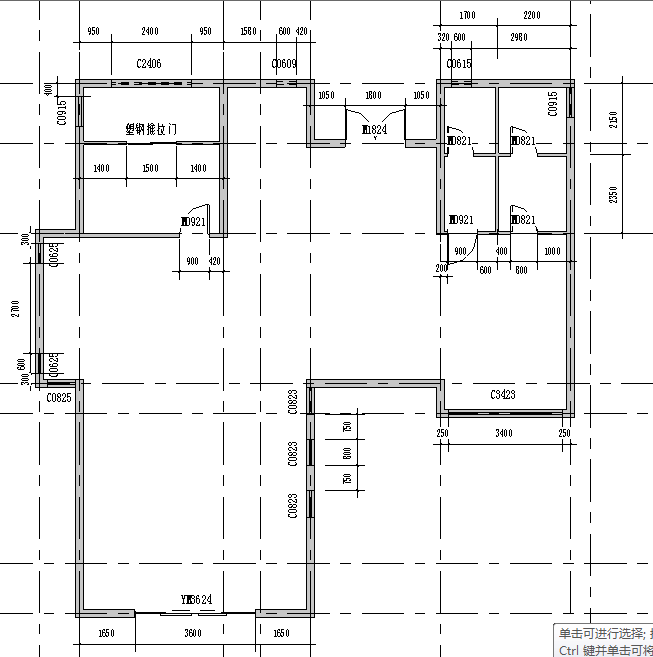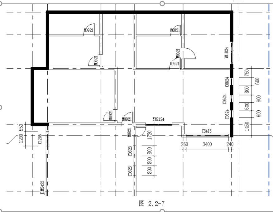 本案例中窗台底高度不全一致, 一次在插入窗后需要手动调整窗台高度。几个窗的底高度值为 “C0624-250mm、C3415-900mm、C0823-400mm、C1206-1900mm。调整方法如下: