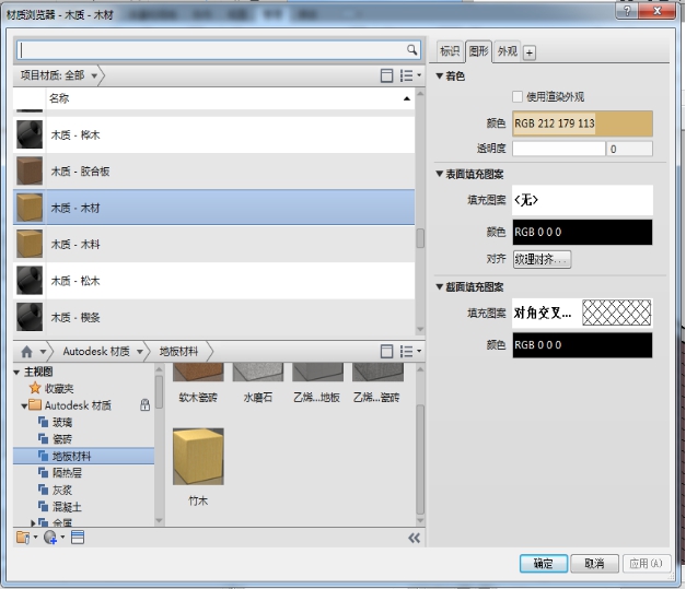 在渲染视图前应该对材质进行编辑与设置,以木质地板的材质为例,在“管理”选项卡的“设置”面板中单击“材质”按钮,进入“材质浏览器-木质-木材”对话框,如图12.1-1所示。