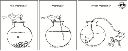 相比 C/C++ 和 Java 而言,Python 代码非常的精简,正如下图漫画所示: