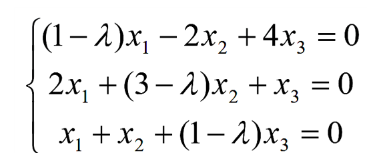 3、当λ取何值时,以下齐次线性方程组有非零解。(提示:n元齐次线性方程组有非零解的充要条件是其系数行列式为零,行列式用det求)